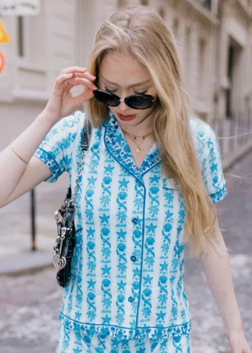 The Pink Palm Pajamas in Seabreeze are a lovely pajama set that allows one to drift into blissful comfort. This posh and breathable sleepwear set is inspired by gentle tropical breezes and quiet ocean waves and is a perfect combination of extra-soft comfort and a laid-back coastal feel.